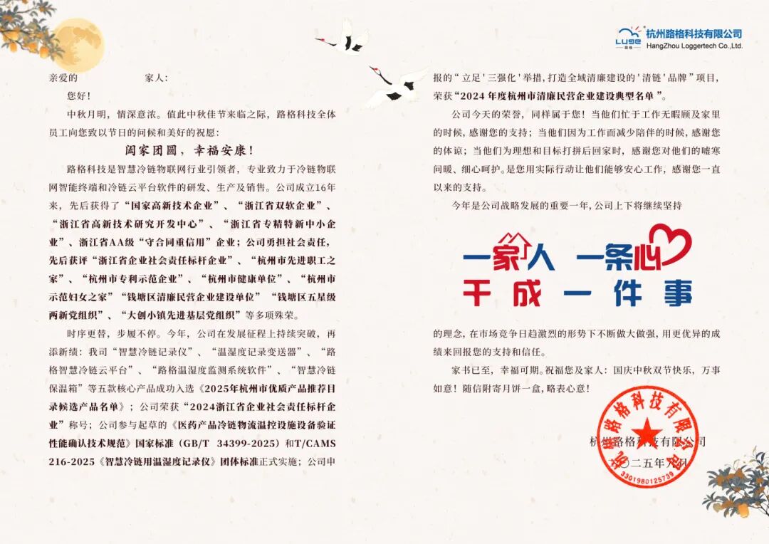 月圆人安,同心致远。相信在全体路格家人的共同努力下,我们定能乘风破浪,共创辉煌!最后,诚挚祝愿全体员工与家人:中秋快乐,身体健康,阖家幸福!愿我们在这个团圆佳节,共享喜悦,共赴美好。